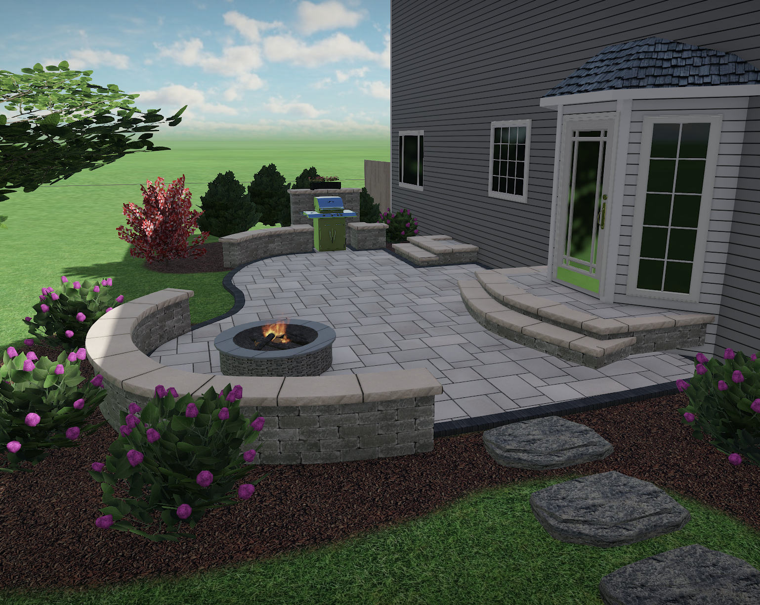 The client's vision was to remove the aging deck, lower the patio surface for greater privacy, and add a grill nook, gas fire pit, flowering plant material, and privacy screening.